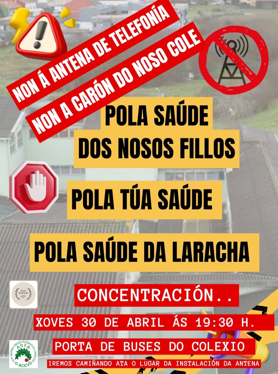 Anda a veciñanza da Laracha en loita. Se por Soandres a loita contra a planta de Biogás, na capital municipal son as familias da ANPA O Acevo Ceip Otero Pedrayo as que pelexan contra a instalación dunha Antena no núcleo da Botica, nunha parcela ao carón do centro.