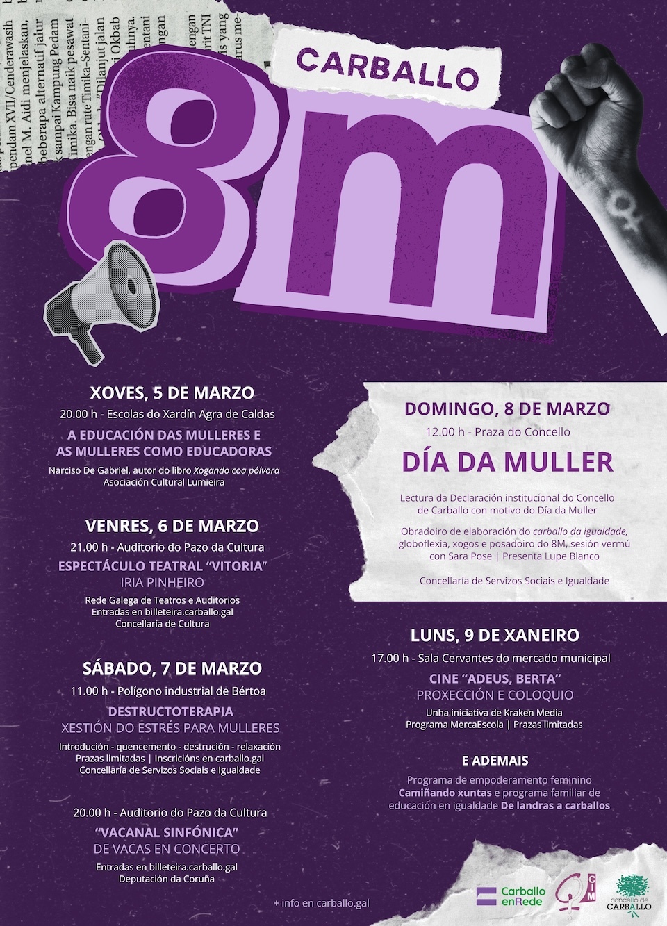 O Concello de Carballo presenta unha programación ampla, diversa e transversal para conmemorar o Día Internacional da Muller, cun conxunto de actividades que combinan reflexión, creación cultural, participación cidadá e procesos de empoderamento feminino.