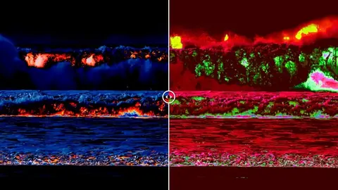 Dende Miradoiro38, na aldea de Sofán, a mirada da cámara percorre os tellados, o arco salvaxe da baía de Carnota, Caldebarcos, a masa sagrada do Monte Pindo e o afastado “Fin da Terra”: o cabo Fisterra. Cada cadro, 80% ceo, convértese nun lenzo en branco para vento, tormentas, estrelas e postas de sol; un tecido de ópera etéreo que sobe e baixa sobre a vida cotiá. Mar en calma, nubes esculpidas de tormenta, arcos de arco da vella, pesqueiros iluminados pola luar: todo aparece e desaparece marcando os ritmos da Costa da Morte. Pola noite, a baía latexa coa actividade dos pescadores: os seus barcos son faros que comunican o mar co ceo. O tempo aquí é unha forza: esculpe montañas, moldea estados de ánimo, define arquitectura e tradición.