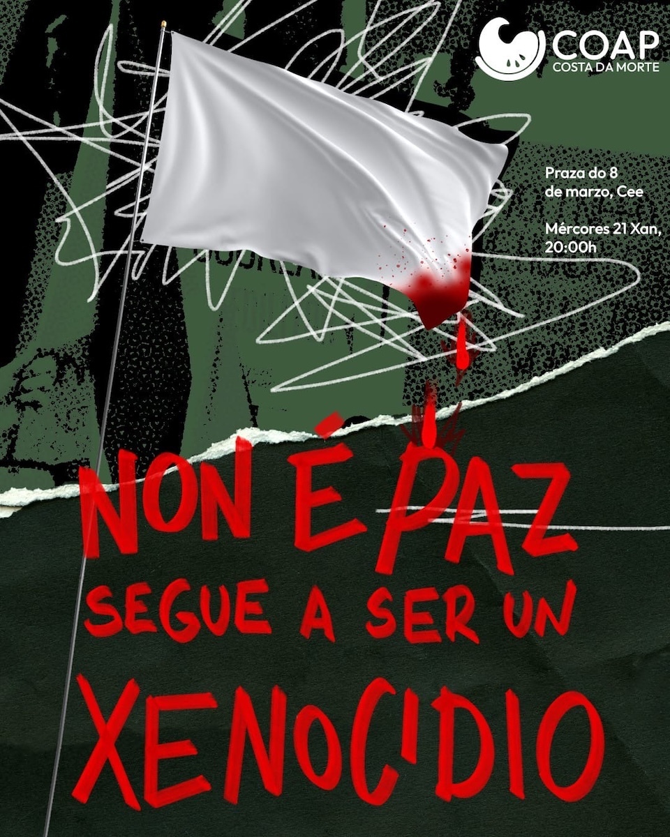 Mentres seguen a matar de fame, de frío, con armas á poboación gazatí, os asinantes do falso acordo de paz fan plans para tutelar e se repartir a súa terra. O xenocidio continúa sen escoitar á cidadanía de todo o mundo, pero dende a Costa da Morte, que levamos décadas sufrindo este conflito como algo noso, queremos seguir berrando.