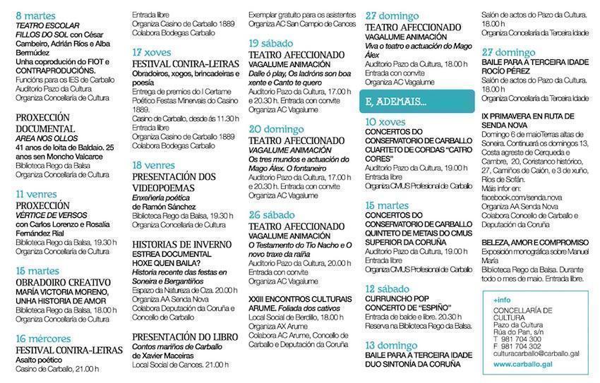 Foron as entidades sociais e culturais e centros educativos, xunto co Concello de Carbalo, o que vén de encher de actividades o programa para as Letras Galegas. Un programa cheo de Teatro, proxeccións audiovisuais, pintura, obradoiros e música comparten protagonismo coa literatura ao longo de todo o mes de maio.