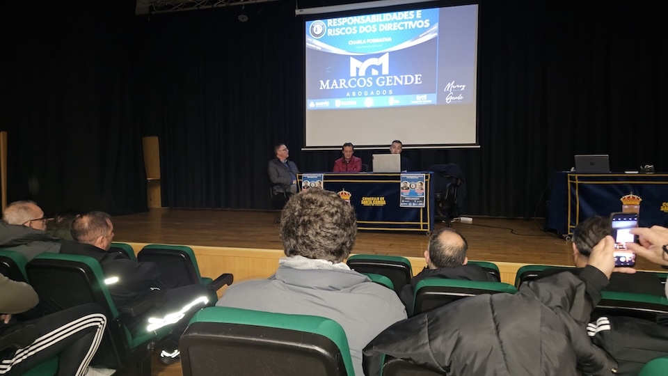 A continuación interveu Marcos Gende, titular de Marcos Gende Abogados, profundou nas obrigas legais ás que se enfrontan os directivos, repasando o marco xurídico actual e as posibles responsabilidades que poden derivarse do día a día da xestión dun club.