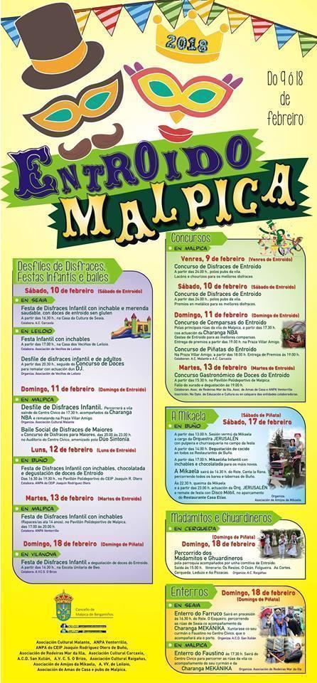 Locais de hostalaría, entidades e Concello de Malpica colaboran para ofrecer o mellor programa festivo da volta. O Entroido é unha das festas grandes do concello malpican, e por iso tanto o Departamento de Cultura como o tecido asociativo e a hostalaría traballan arreo  para ofrecer o mellor programa posible. Así, un ano máis, avecinase un Entroido cheo de propostas para tódolos públicos que converterán Malpica nunha das referencias das celebracións en toda Galicia.