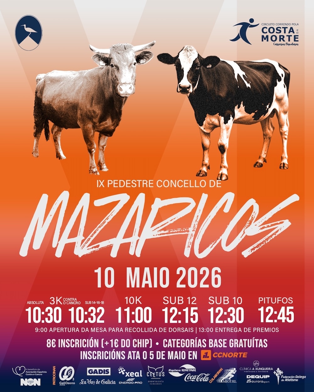A organización abrirá a mesa para a recollida de dorsais ás 9:00 horas, e a xornada culminará coa entrega de premios prevista para as 13:00 horas.