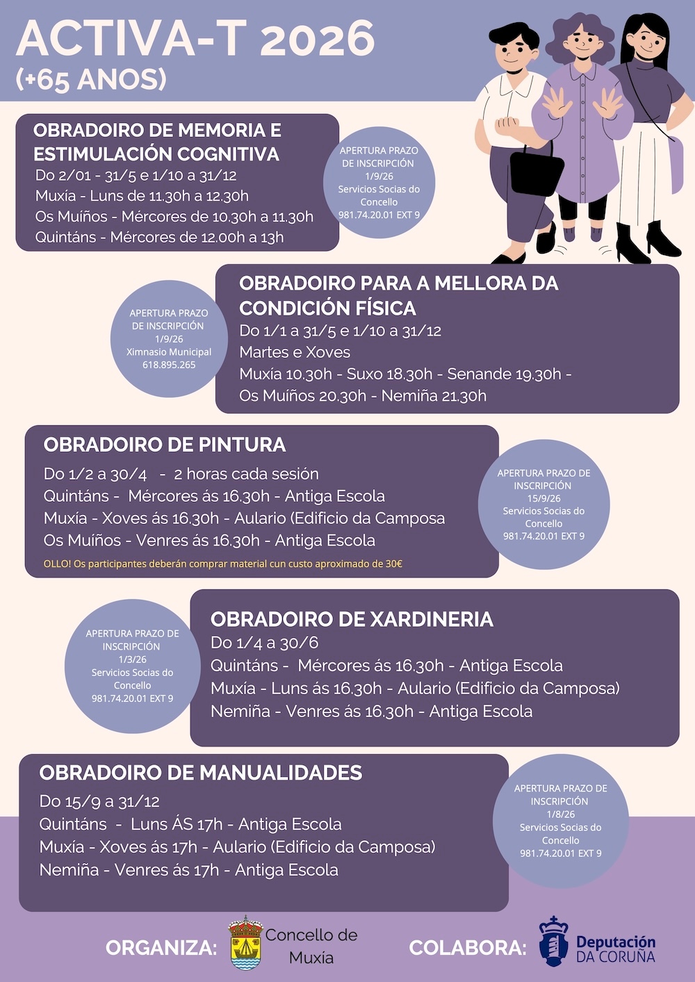 O Concello de Muxía presenta unha nova edición do programa ACTIVA-T 2026, unha iniciativa dirixida a persoas maiores de 65 anos e cofinanciada pola Deputación da Coruña, que ten como obxectivo principal promover o envellecemento activo, a participación social e o benestar da veciñanza.