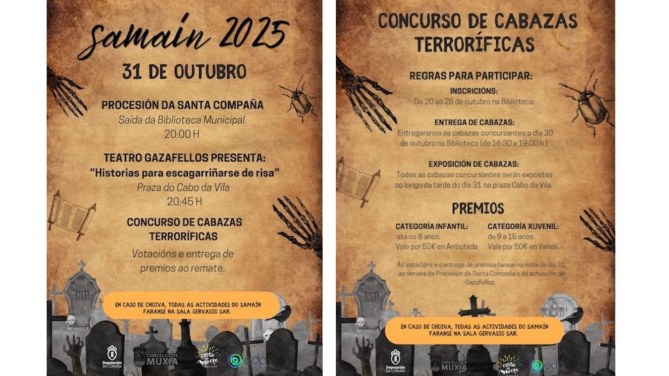 O Concello de Muxía celebra o vindeiro venres 31 de outubro o Samaín. Trala boa acollida do ano pasado, este 2025 volverá pasar a Procesión da Santa Compaña, camiño de converterse en tradición. A comitica partirá ás 20:00h da Biblioteca, cun percorrido cheo de misterio e festa.