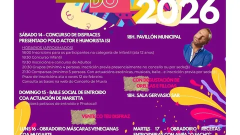 A programación do Entroido complétase cunha ampla e variada oferta de actividades que dará comezo o sábado 14 de febreiro coa Festa de Entroido, que contará con inchables, maquillaxe, xogos e as actuacións de Asacocirco e DJ Rokiño. Ademais, instalarase unha cantina a beneficio do alumnado de 4º da ESO do IES Maximino Romero. A cita terá lugar no Polideportivo de Baio a partir das 17:00 horas.