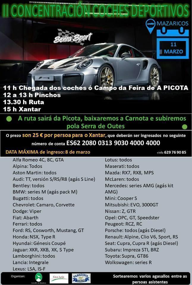 Evento Concentración de coches deportivos en Mazaricos 11/mar./2018 a 11/mar./2018 11:00 h a 6:00 h Concentración de coches deportivos en Mazaricos m Redacción 13:08 28/02/18