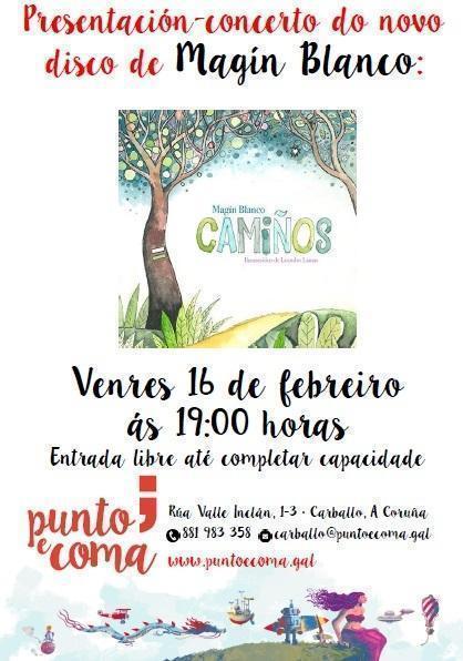 A libraría Punto e Coma de Carballo acolle vindeiro venres, día 16 de febreiro, o concerto do gran Magín Blanco na Libraría Punto e Coma, virá a presentar o seu novo traballo "Camiños" Un fantástico libro-Disco con cancións para toda as idades.