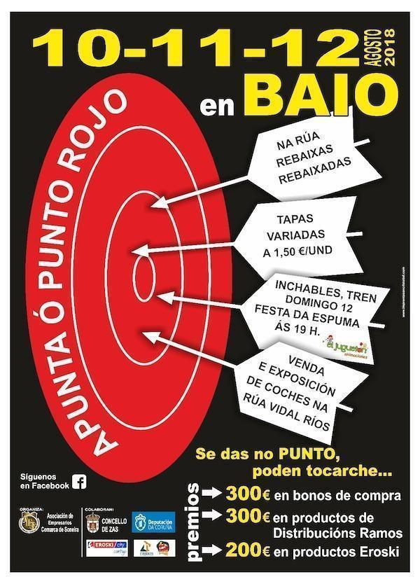 A Asociación de Empresarios Comarca de Soneira organiza unha nova edición do “Punto Rojo” que terá lugar os días 10, 11 e 12 de agosto en Baio. Citas que serven para dinamizar o comercio local, seguindo o camiño de accións tan exitosas como o ”Baio ten a pelota” ou a simbólica xornada de peche dos comercios.